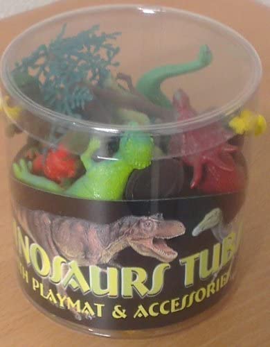Assorted dinosaurs Play set and Play mat. 6 Dinosaurs, 2 trees, 2 Rocks, 1 hill and 1 play mat all in a smart little tub with string handle.