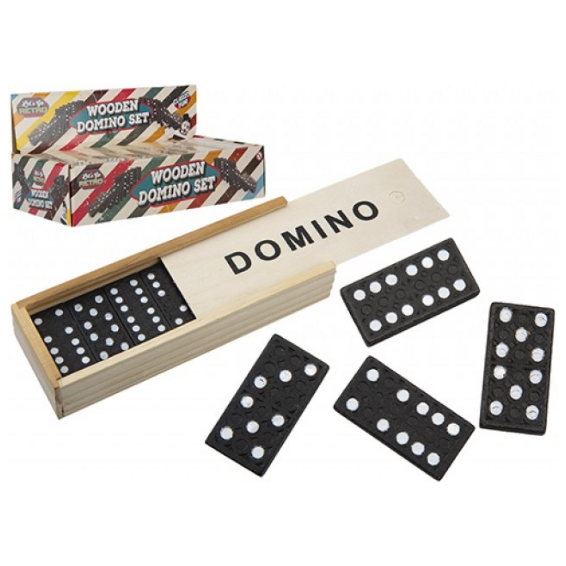 - Includes: 28 Black Dominoes in Wooden Box