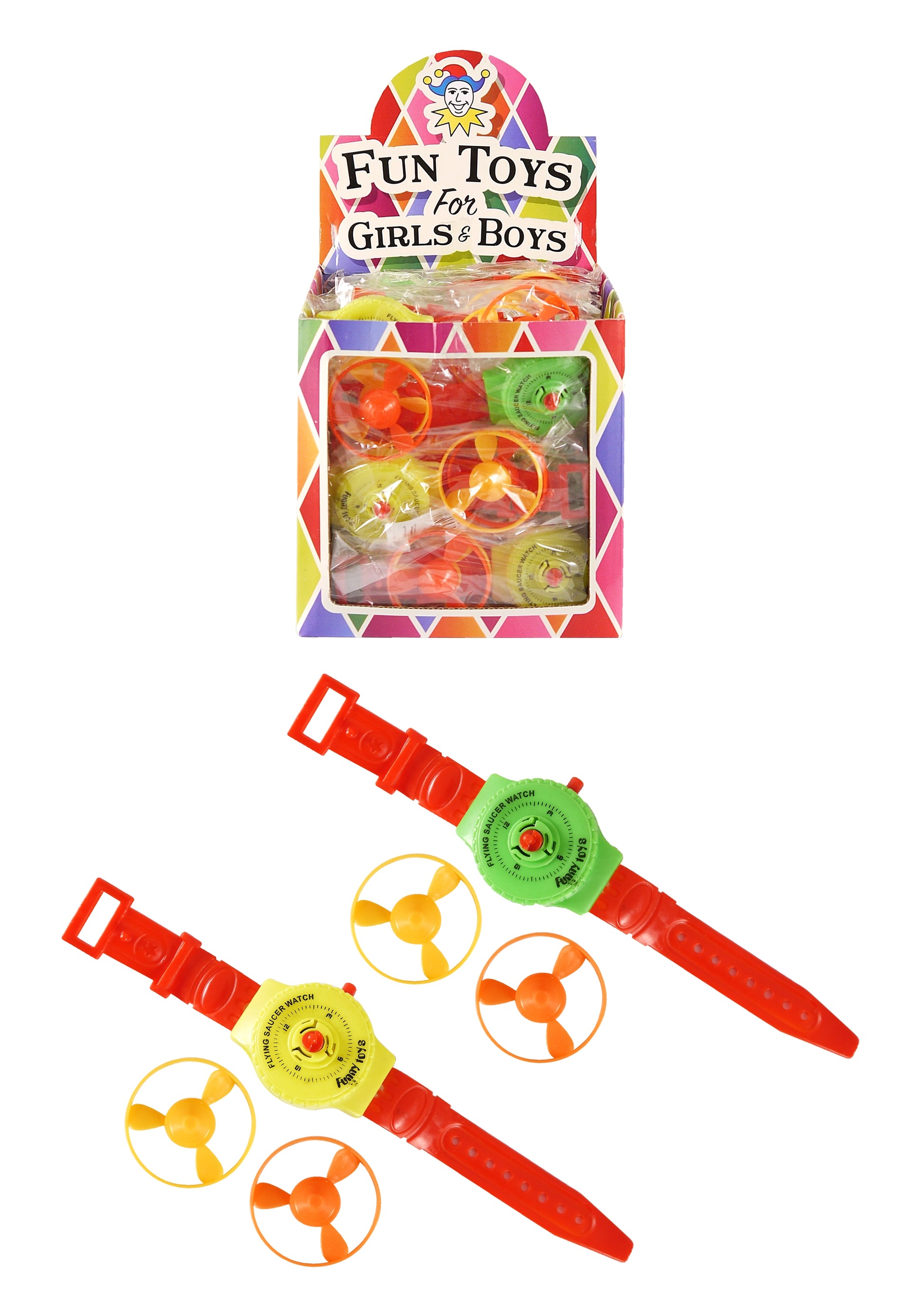 These fun launchers make ideal party favours and lucky dip prizes. Place the disc on the watch and turn it clockwise. Push the launch button and watch them fly off! Each watch comes with 2 discs. 2 assorted colours.