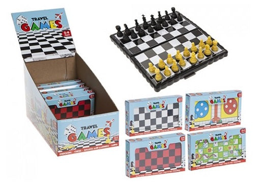 Four assorted travel games: Draughts, Snakes & Ladders, Ludo and Chess. These games are the perfect size for taking away on holidays and on long journeys.