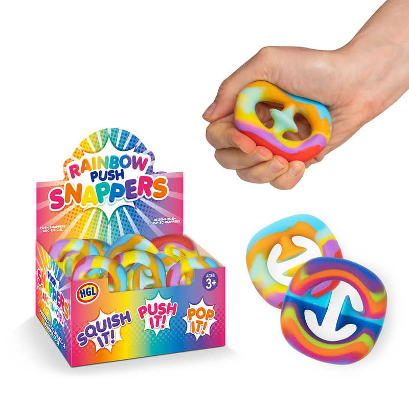 Super addictive fidget toy that creates a satisfying snap sound with every squeeze. Push the two side of this snapper together and the pair of suction cups inside will connect. Release your grip, and the shape pulls the caps apart to create a loud snap. Get the momentum right, and you can rattle of dozens of snaps in just a few seconds. Comes in a funky rainbow design, with stripes of bright colours spread right across the toy.