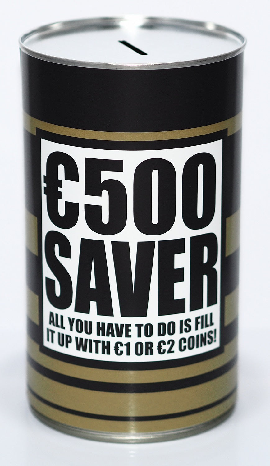 This large Savings Tin (17.5cm) can hold up to £1000 when filled with £1 and £2 coins. The only way to get your money out is with a can opener!