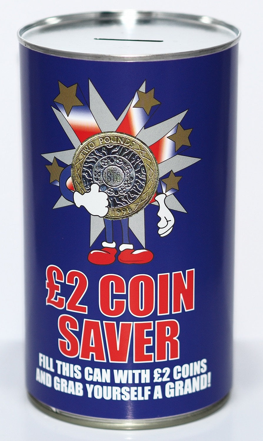 This large Savings Tin (17.5cm) can hold up to £1000 when filled with £1 and £2 coins. The only way to get your money out is with a can opener!
