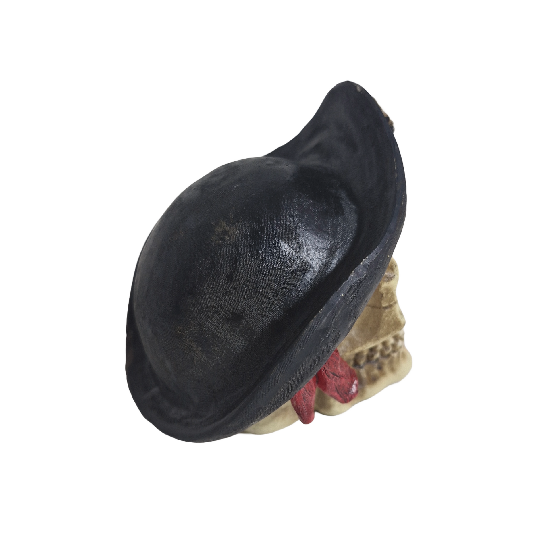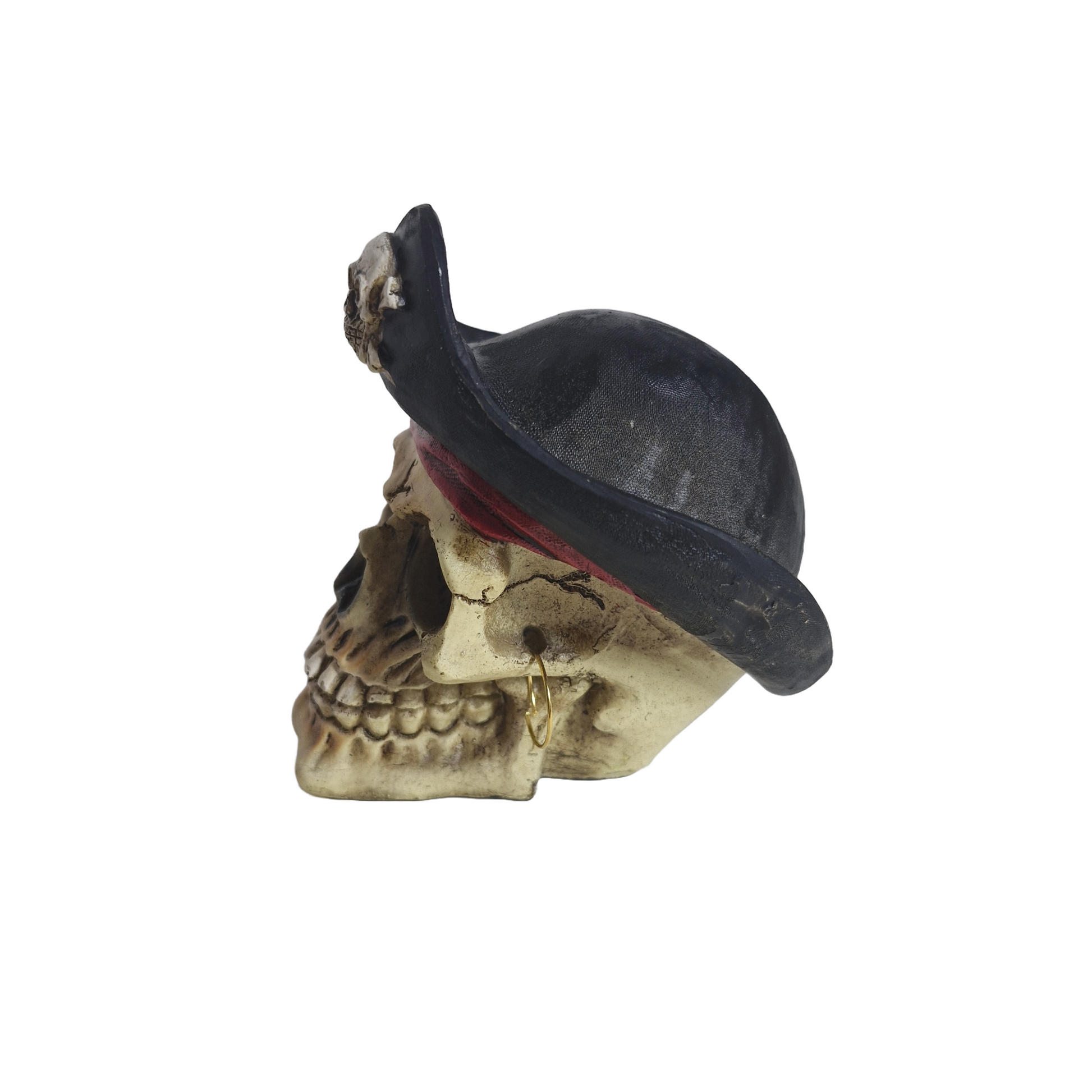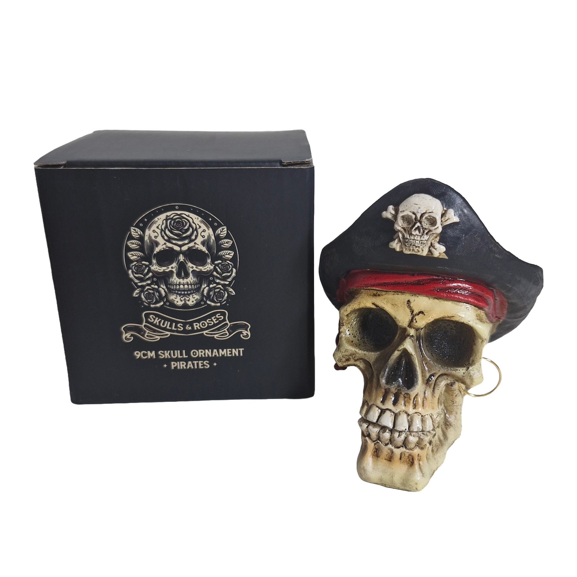 Add a touch of nautical mischief to your décor with this detailed 9cm pirate skull ornament. Featuring a classic skull design with a black pirate hat, red bandana, and gold earring, this piece captures the classic rogue pirate look. It's perfect for Halloween, themed rooms, or any collector of pirate memorabilia. Made from durable resin, this compact piece is ideal for desktops, shelves, or display cabinets.