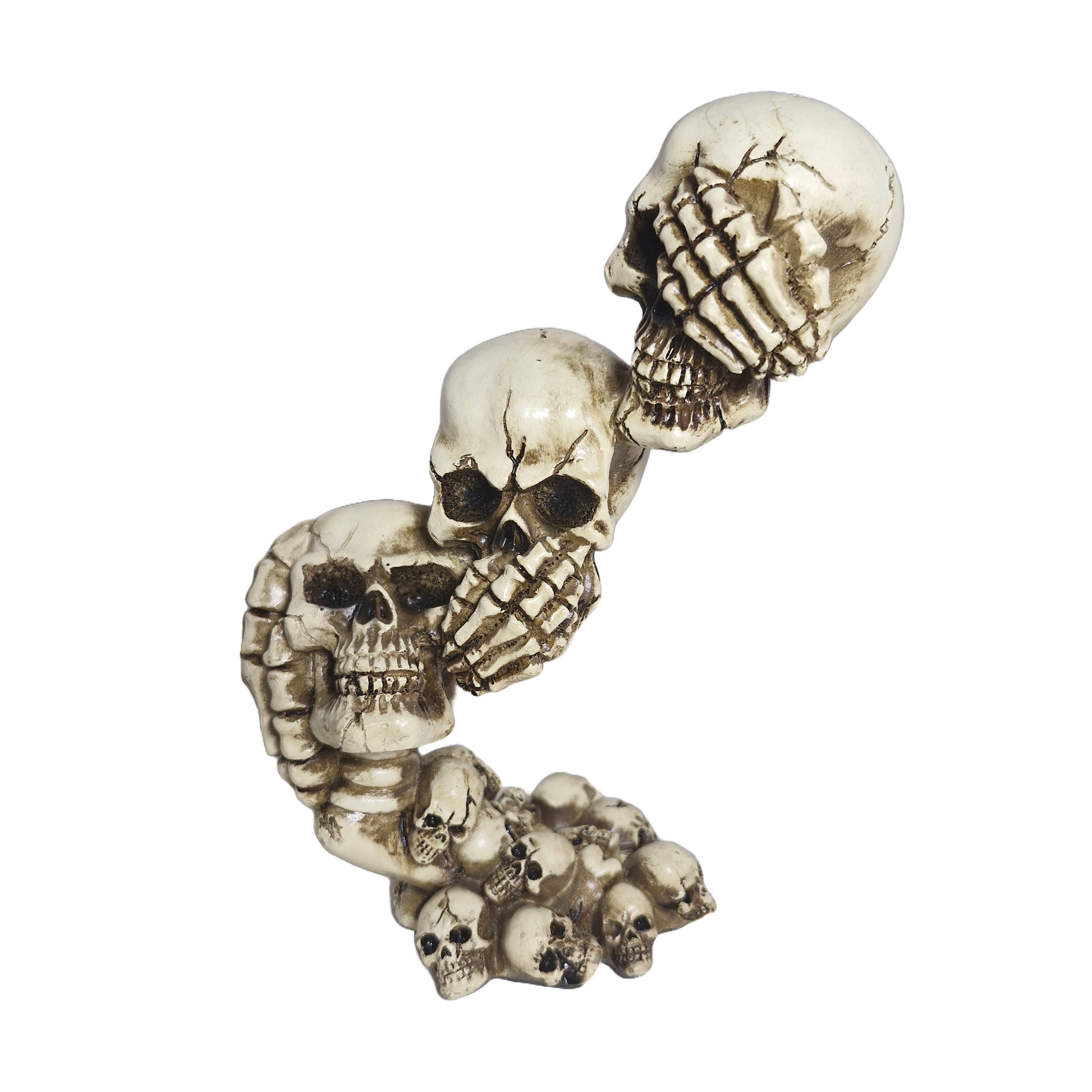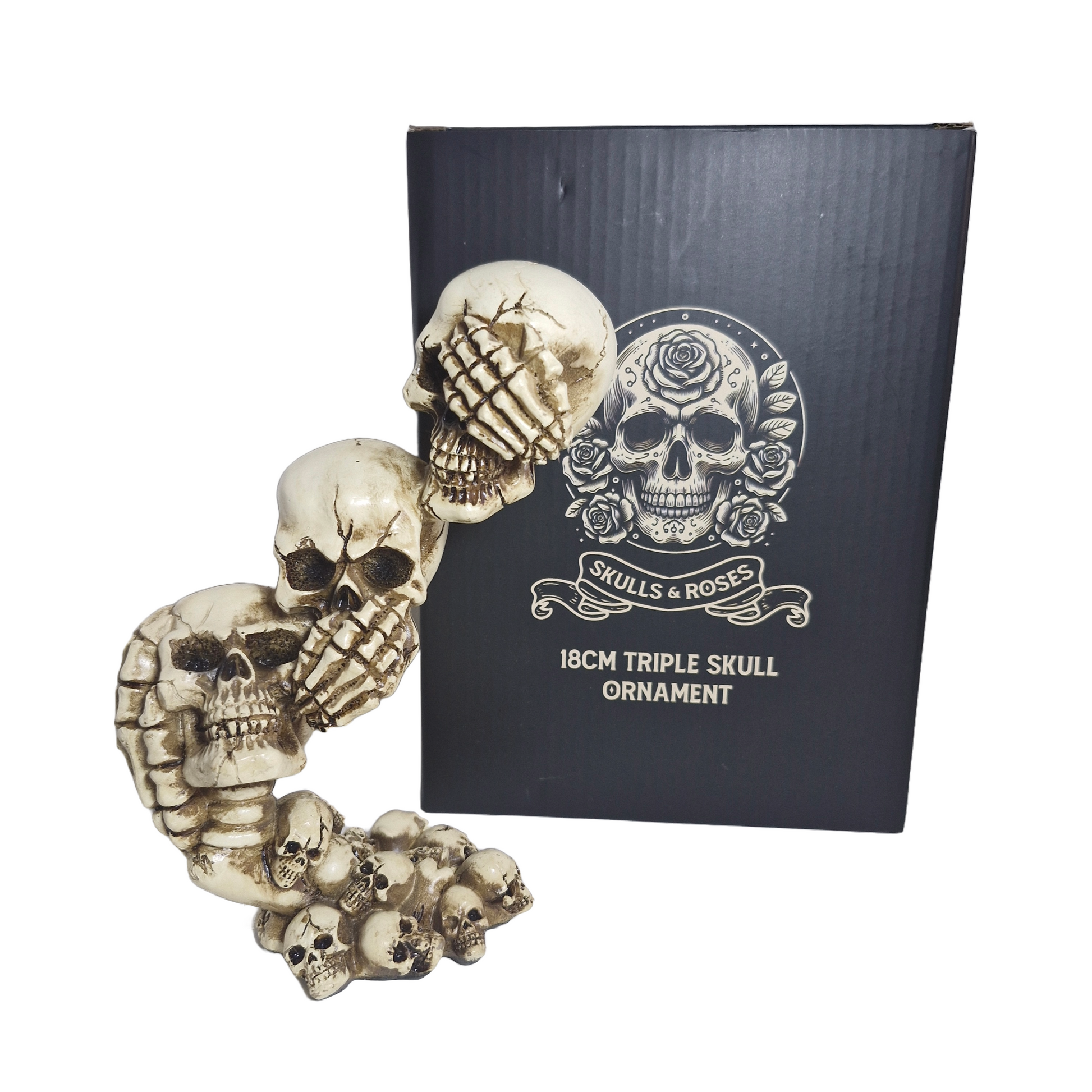 Make a bold statement with this striking 18cm triple skull ornament. Featuring three intricately detailed skulls side by side, this piece adds a dark and dramatic touch to any shelf, desk, or display. Crafted from polyresin with a realistic bone finish, it’s perfect for gothic décor, Halloween setups, or collectors of macabre art.