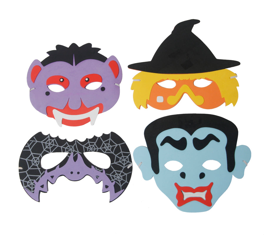 These colourful masks are ideal Halloween party favours or fancy dress accessories. Elasticated band for easy and comfortable wear. 4 assorted designs.